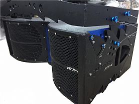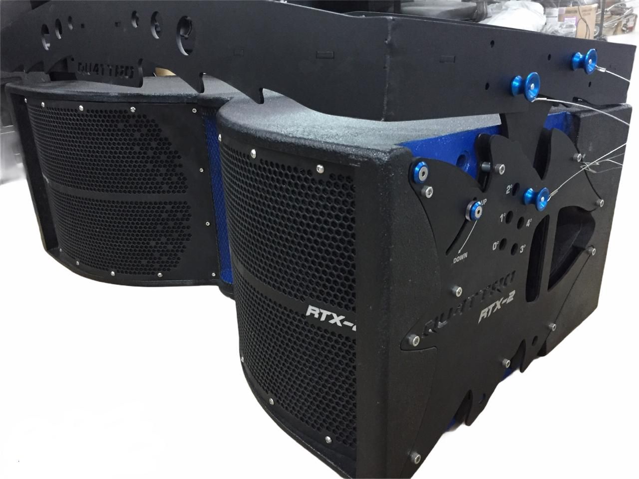 Caixa Line Array de alta performance, marca QUATTRO, modelo RTX-10 v2, equipada com dois falantes de 10 polegadas da linha QUATTRO com fio de cooperclad e bobina de 3", cone, suspensão e centragem americanos, e dois drivers de titânio bobina 1,7" B&C Speakers com membrana em polyamida.